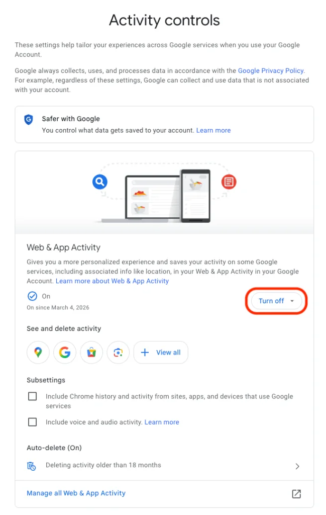 - Click on that quick control button we saw earlier: Web & App Activity